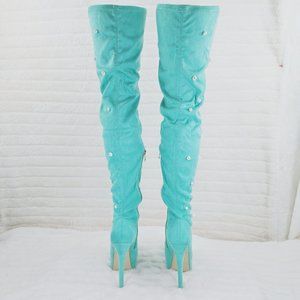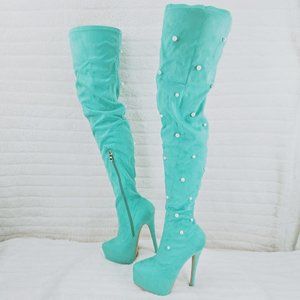 Mint Green Faux Stretch Suede Platform High Heel Thigh High Boots
