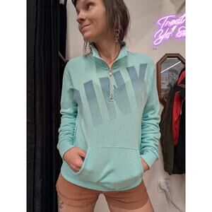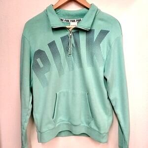 Stay cozy and stylish in this Mint Green PINK Quarter Zip Pullover from Victoria’s Secret. Made with soft fleece for all-day comfort, this laid-back essential features a relaxed fit, high collar, and quarter-zip closure for easy layering. The pastel mint hue adds a fresh pop of color to your casual wardrobe, while the iconic PINK logo brings a sporty touch. Perfect for lounging, running errands, or throwing on post-gym.
