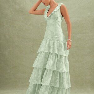 Mint Green Party Women's Floral Textured Tiered Ruffle Maxi Dress Dresses