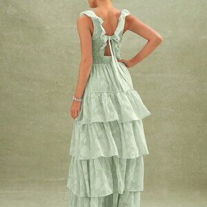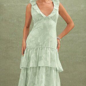 Mint Green Party Women's Floral Textured Tiered Ruffle Maxi Dress Dresses