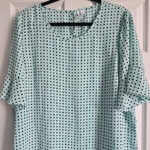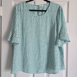 This charming blouse is the perfect addition to your spring and summer wardrobe. The soft mint green color provides a fresh pop, while the all-over black polka dot print adds a playful, retro touch.