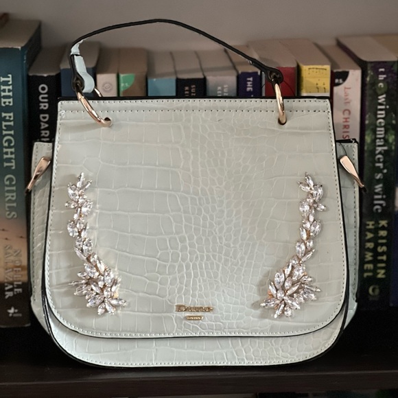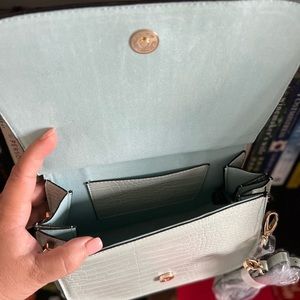 Lovely mint-green purse with messenger strap. Lovely rhinestones make it perfect for a night out. Brand new. Never used.