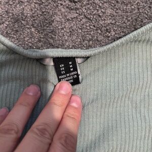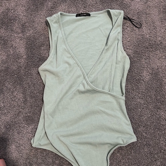 Chic light green bodysuit . Features a ribbed texture and wrap design. Ideal for versatile styling.