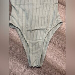 Stylish mint green ribbed swimsuit. Features a flattering V-neck and thin straps.