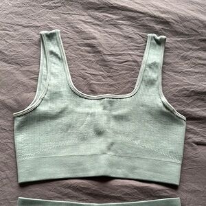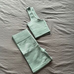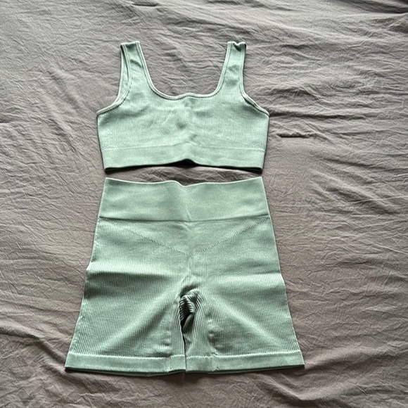 Stylish mint green ribbed two-piece set. Includes a crop top and shorts. Perfect for casual wear.