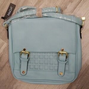 Square shaped bag with a fashionable geometric pattern stencil cut out design. Two buckles and gold tone hardware. The attachable strap measures 24 - 45 inches. The bag measures 9.5x9.5x2 inches. Two types of closures- a zipper and a magnet closure within the buckles of the bag. High end interior lining. Faux leather.