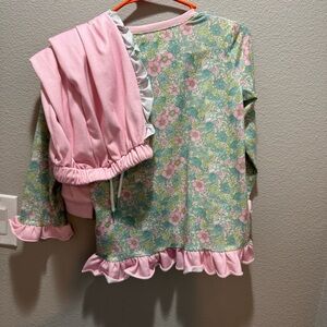 This adorable pajama set features a mint green top adorned with a lovely floral print and light pink ruffles at the hem and sleeves. The set includes a solid light pink coordinating piece, making it perfect for a comfortable night's sleep.
