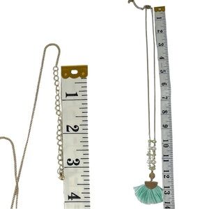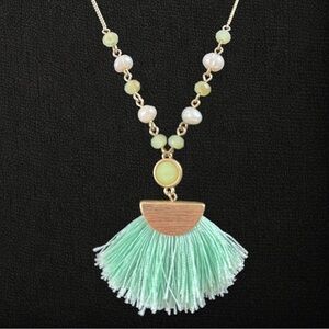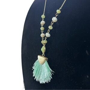 Beautiful long accent necklace with mint green and pearl-like beads and a pale aqua fan thread pendant. Dainty gold-tone chain necklace with adjustable length and traditional spring ring clasp.