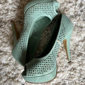 Super cute heels for a pop of color. In great condition! Features cut out design, open toes, and beautiful mint green color.