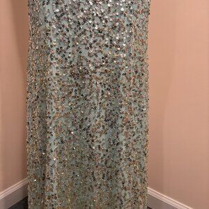 This sequin dress has a mix of mint, gold, and silver sequins, making it a great dress to accessorize with with anything will match it! It is a mermaid silhouette and a size 4. This dress has never been worn with the tags still on. The zipper is fully functional with a hook and eye at the top; it also has criss cross adjustable straps. This would be a great dress for prom, a formal party, a formal cruise dinner look, or a gala!