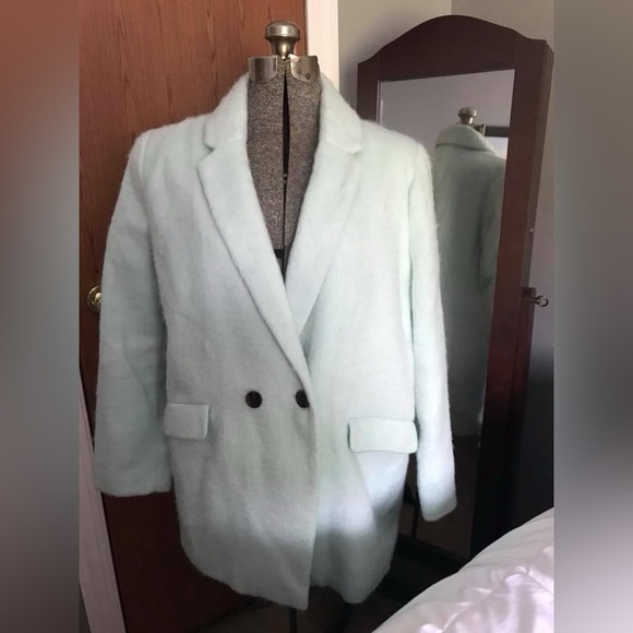 Mint green wool overcoat. 100% polyester lining with 60% Polyester, 40% wool shell