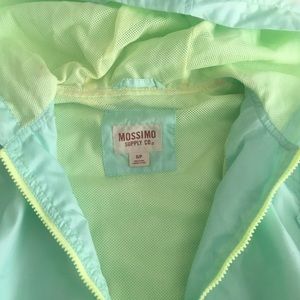 Cute lightweight hooded rain jacket in a pretty mint color. Pockets on the sides and elastic on the wrists and waist band. Size small. Merona by Target.