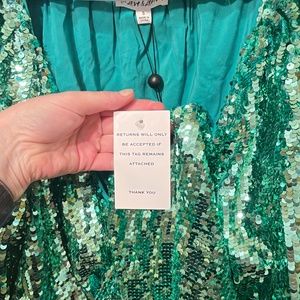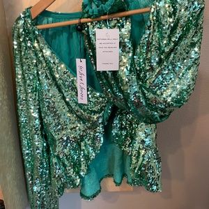Made for a Disco Queen! Brand new amazinggggg front tie shirt covered in the shiniest green/mint sequins I've ever seen. Ties in front with ruffles along the bottom. Truly the cutest! Sold out online