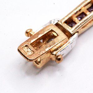 Indulge in the timeless elegance of this stunning tennis bracelet. Expertly crafted from sterling silver, this bracelet showcases a captivating combination of silver tone and gold tone finishes. The gold tone sections are adorned with shimmering purple crystal Cubic Zirconia, while the silver tone sections feature a single CZ at the center, adding a touch of sophistication to the design. Marked with the prestigious "925" stamp, this bracelet guarantees the authenticity of its sterling silver composition. In mint condition, it radiates with impeccable quality and is ready to grace your wrist with its exquisite beauty. The push-pull clasp ensures a secure and comfortable fit, providing both convenience and peace of mind. With a weight of 15.4 grams and a sleek 7-inch length, this bracelet effortlessly complements any ensemble, while its 7mm width adds a touch of refinement. Elevate your jewelry collection with this enchanting tennis bracelet, a true symbol of grace and style.