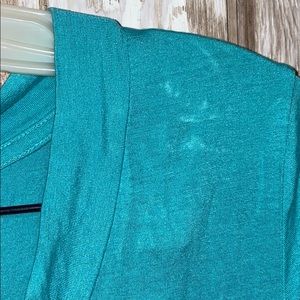 Mossimo stretchy green V tshirt. Back is a little longer. FHA’s a slight discoloration on the top left shoulder. (Wrinkled from being in drawer)