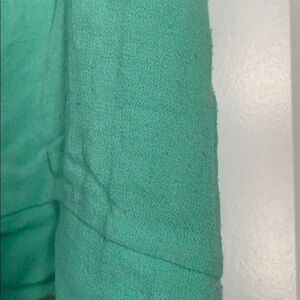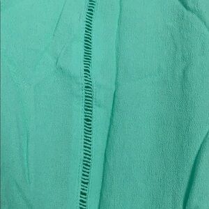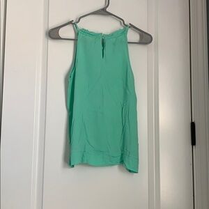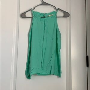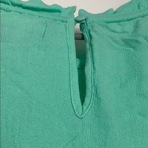Mint green tank top with pattern down the the middle. Neck has some ruffles. Back has a peep hole with button.