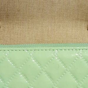 Mint green wallet. Holds 8 credit cards, has 2 long pockets on each side behind credit card slots, 2 standard areas to hold cadh or checkbook as well asa zipping change holder in the center. This item is new has never been used does not have the tag. There is a small area and I mean microscopic of coloration I saw it before I bought it but it is so tiny I bought it anyway. I want to point that out just so there are no surprises. I will show it in a close up in the last photo.