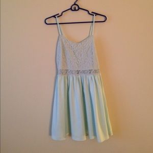 This is a beautiful mint lace dress with adjustable straps, a slip underneath, and a hidden side zipper. The dress is from H&M and is a size 6, but I am a generally a size 2/4 and it fits perfectly. I recommend wearing nude/black undergarments with this dress.