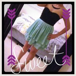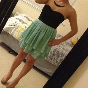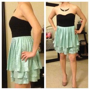 BRAND NEW-Trendy mint color with black sweetheart neck line. Bottom of dress has a shimmery mint color with three tiers. Zips in the back.