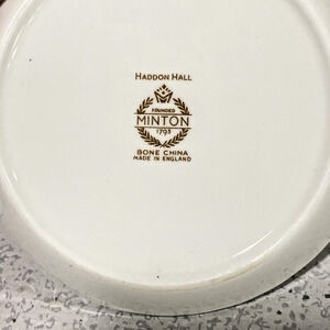 Vintage porcelain coasters set of 2 - Minton fine bone china in the Haddon Hall Chintz pattern - made in England. This is a charming pattern in pure white with multicolor floral design and a gently scalloped upturned rim. Both pieces are clearly hallmarked and both are in excellent condition with no damage or flaws.