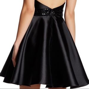 Halter neck - Sleeveless - Hidden back zip closure - Beaded waist trim - Flared skirt - Open back - Approx. 33" length