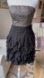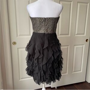 Minuet Strapless Party Formal Evening Cocktail Dress. Worn once! Fun and flirty strapless dress with gold metallic bodice and black, layered, feather-like cut chiffon skirting. Softly molded bodice shapes you nicely with soft cup molding, structured interior bones at sides of bodice, and interior rubberized banding strip along top keeps the dress securely in place. Hidden back zipper with hook and eye closure. Fully lined skirt. Lightweight. Simple elegance!