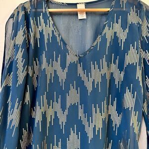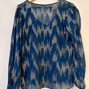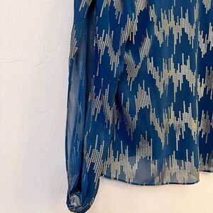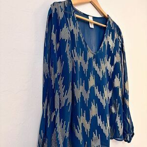 This Minx navy blue blouse with a shimmering gold print is a trendy piece that features a stylish cold arm design with a flattering V neckline. It's a lightweight, easy-to-wear top that you can simply pull over for instant glam in size large.