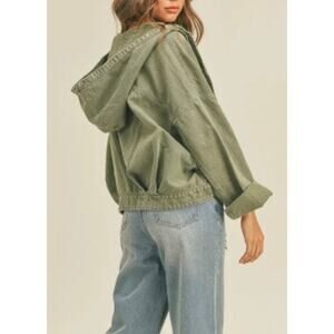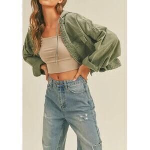 Effortlessly cool and casual, this olive green cropped jacket from Miou Muse combines a utility vibe with laid-back style. Made from 100% cotton for a breathable feel, it features a drawstring hood, dual front flap pockets with snap closures, and a full snap-button front. Perfect for layering over tanks or tees during transitional seasons. Designed in Los Angeles.
