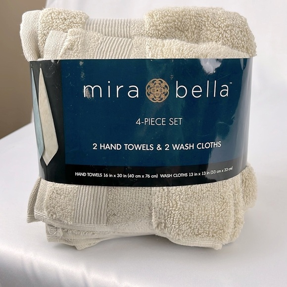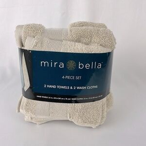 Mira Bella 4 pc Light Tan Towel Set, 2 Hand Towel 16x30 2 Washcloth 13x13 NWT