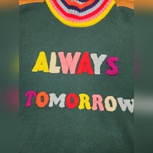 Vibrant sweater with bold stripes. Features 'ALWAYS TOMORROW' text. Perfect for a playful look.