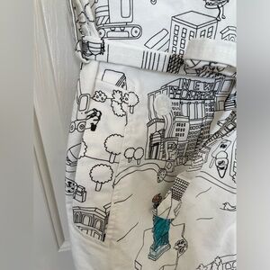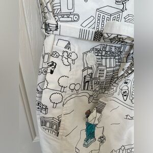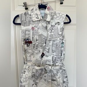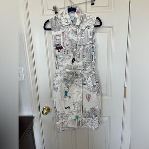 Playful and artsy Mira Mikati sleeveless shirt dress featuring a whimsical black-and-white illustrated cityscape print with pops of vibrant color. Design includes charming urban details—buildings, trees, hot air balloons, cars, and quirky characters—for a fun, street-art-inspired look. Classic collared neckline, button front closure, and removable self-tie belt for a flattering fit. Lightweight fabric makes it perfect for warm weather, vacations, or statement everyday wear.