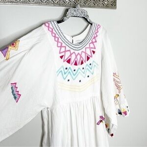 Flowy white maxi dress that can be dressed up or down. Please note that the bright colors along the bottom of the dress have been changed (pictured). Otherwise in good used condition.