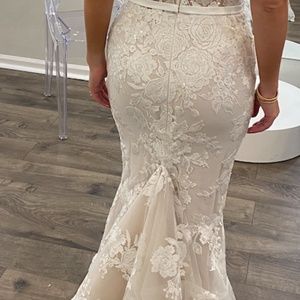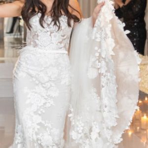I absolutely loved this custom made Mira Zwillinger Sammy Gown. I wore this dress on my wedding day and it was stunning. The color is white with nude underlining. The dress has been professionally cleaned. Perfect for a petite woman Height 5'0"-5'1" and size 0.