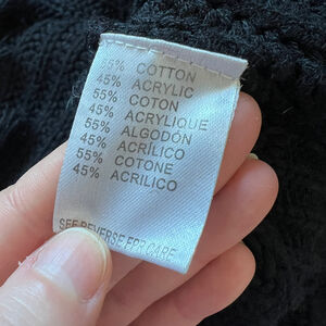Crochet knit crop top in black with a relaxed fit. Distressed hem adds an edgy vibe. Soft cotton-acrylic blend.
