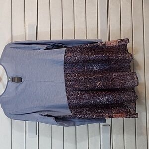 Chic tunic with intricate blue and purple patterns. Soft fabric and relaxed fit. Ideal for versatile styling.