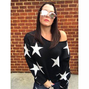 The Miracle Navy Star Distressed Sheer Sweater Top is a stylish, versatile piece that offers a comfortable fit for small/medium sizes. It boasts a distressed design for a trendy, relaxed look.