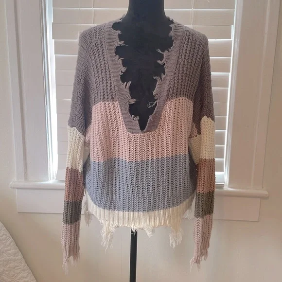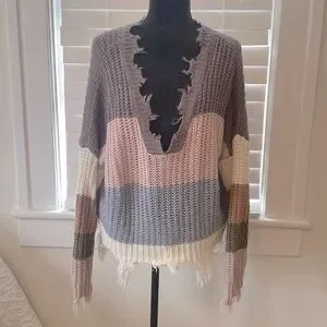 Striped raggedy sweater by Miracle. Size small. Stripes are eggplant, blush pink, steel blue, and off white. Can be worn on or off shoulder. Oversized and super cute on!