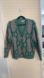 Chic knit sweater with green and gray patterns. Perfect for layering.