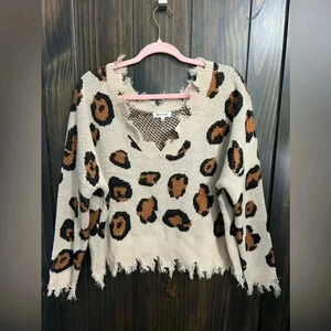 Miracle Wild About You Cheetah Print Distressed V-Neck Cropped Sweater Size S/M