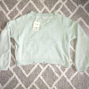 Miracle Women's Mint Green V neck Distressed Hem Knit Long Sleeve Sweater