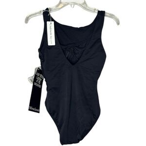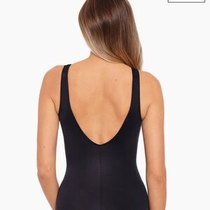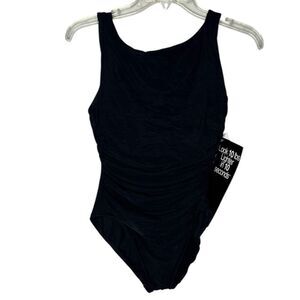 Miracle Suit Regatta Black One-Piece Swimsuit. Size 10. Soft cup bra. Can accommodate up to a D cup. Chic high bateau neckline. Fixed straps. Scoop neck. Moderate leg cut. Draped fabric conceals tummy. New with tag.