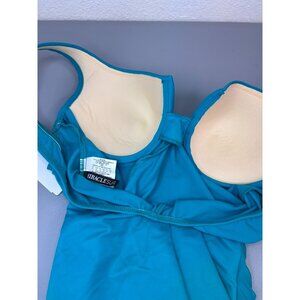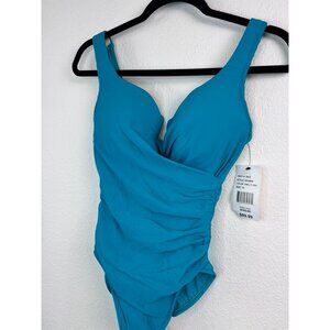 MiracleSuit brand women's size 10 Amalfi green criss cross escapre wrap style one piece swimsuit. Brand new with tags. Has a built in underwire lightly lined bra. Ruched sides for a slimming effect.