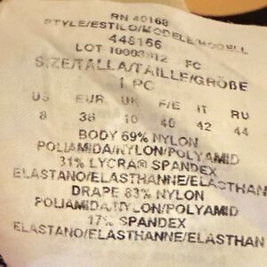 Excellent, clean condition. No loss of elasticity....fabric feels like new with a lot of compression. No fading of the colors. Lots of ruching/shirring around the tummy area for excellent camouflage.