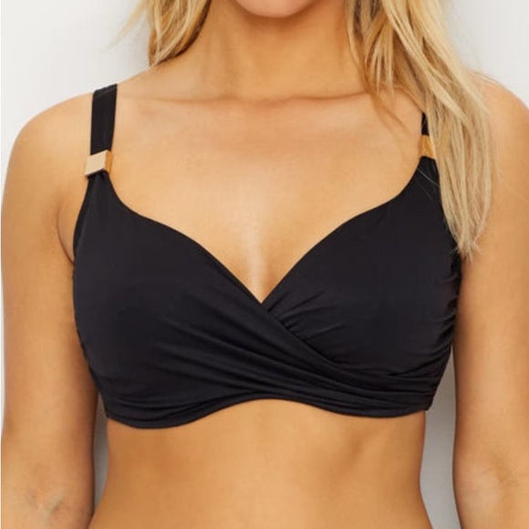 Elegant black bikini top by Miraclesuit. Features supportive straps with gold accents. Perfect for a stylish swim look.