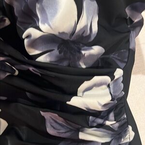 Stylish swimwear by Miraclesuit. Features a classic black and white floral design. Ruching in waist area. Straps have some stretch but are not adjustable. Low dip in back