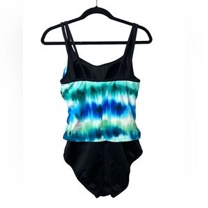 Stylish One Piece swimsuit with a blue and green pattern. Features black straps and bottoms.