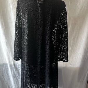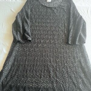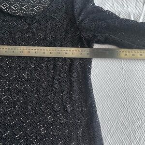 Chic black crochet design. Features scoop neckline and three-quarter sleeves. Ideal for versatile styling.