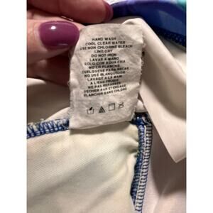 Elevate your beach style with this Miraclesuit halter tankini swim top in a vibrant blue and green tropical floral print. Designed with a padded bust and ruched front for a flattering fit. Size 10. Made with a nylon-spandex blend for comfortable stretch and shaping support. Excellent preowned condition.