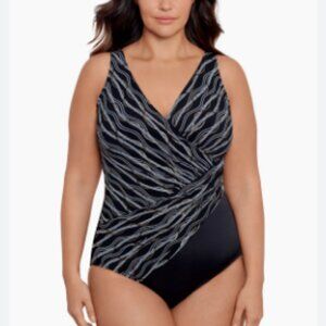 Miraclesuit Oceanus Wireless in Linked In Black and White with Hints of Gold One Piece Swimsuit Size 18W. No Flaws. Material tag has some wear but size is still visible. Great Used Condition!