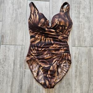 Miraclesuit One Piece Swimsuit Size 14 Brown Tropical Leaf Underwire Ruched